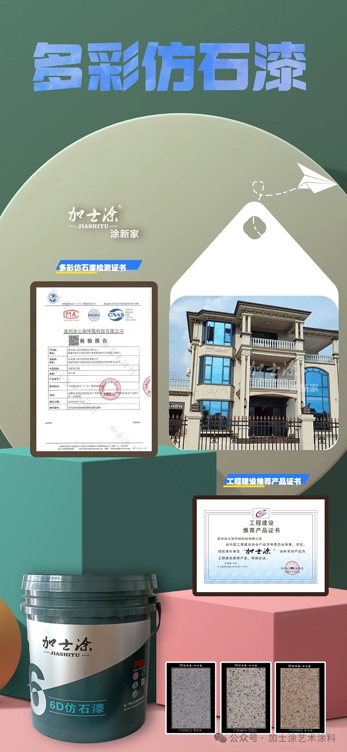 加士涂不斷創(chuàng)新,相繼推出 2D 真石漆、3D 崗石漆、4D 冠石漆、5D 晶石漆及 6D 荔枝面等系列產(chǎn)品。以卓越品質(zhì)守護(hù)安全,致力于讓每一個(gè)家都綻放最美光彩!