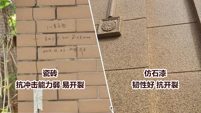 干掛石材和瓷磚較重,給墻體增加負(fù)擔(dān),易脫落,存在較大安全隱患。相比之下,加士涂仿石漆優(yōu)勢(shì)明顯,其附著力強(qiáng),負(fù)荷低,漆膜自重小,不給墻體造成壓力,所以不易脫落,安全性能更高。選擇加士涂仿石漆,讓您的家更安全、更美觀!